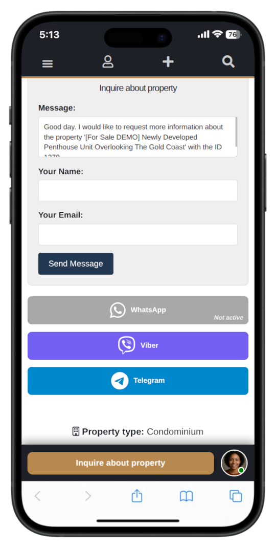 - Multiple contact lanes are supported—including inbox, email, phone, and popular messaging apps—so serious prospects can reach you on your terms.