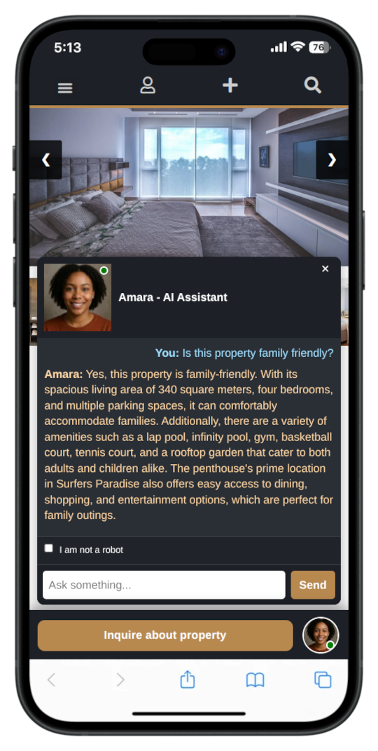 - Always-on concierge. A property-specific AI assistant answers questions 24/7 and nudges visitors toward the next action.