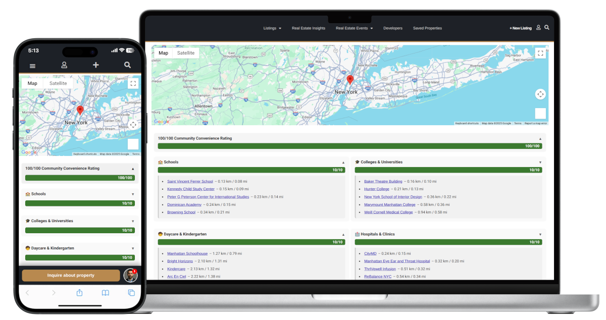 - Toggle any category to reveal the closest amenities with names and distances—clear, helpful, and conversion-oriented.