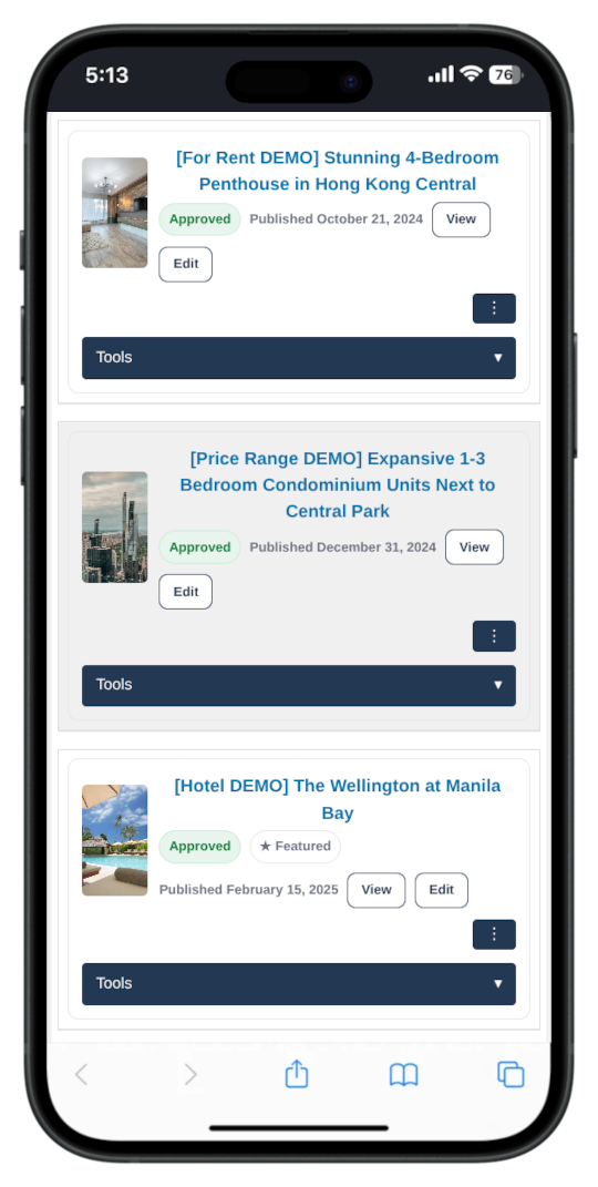 - At-a-glance dashboard: thumbnail, description, status (For Sale / For Rent-Lease / Sold-Rented-Leased), Featured flag, approval state, and quick edit/delete.